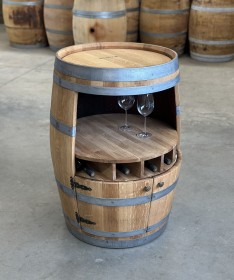 Weinfass Bar mit großer Öffnung, kleinen Türen und kleinem Flaschenregal