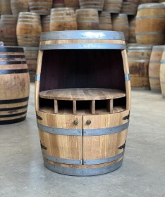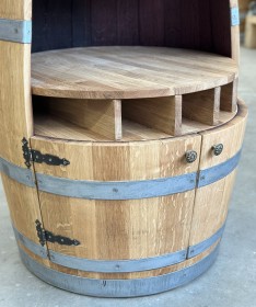 Diese Variante unserer Weinfass Bar besticht durch ihre einzigartige Optik mit einer großen Öffnung sowie zwei kleinen Türen im unteren Bereich. Die Türen werden mithilfe von Magneten sicher geschlossen und lassen sich über rustikale Türknäufe bequem öffnen. So bietet das Fass sowohl im oberen als auch im unteren Bereich ausreichend Stauraum für Flaschen, Gläser und Barzubehör. Ein besonderes Highlight befindet sich in der Fassmitte: Ein integriertes Flaschenregal mit fünf Fächern, ideal zur liegenden Lagerung und dekorativen Präsentation von Weinflaschen.