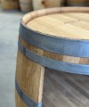 Für die Fertigung dieser rustikalen Weinfass Bar schleifen wir die Fässer außen sorgfältig ab, um grobe Unreinheiten und Splitter zu entfernen. Auch die Fassringe werden entgratet, um Verletzungen zu vermeiden. Die einzelnen Dauben werden zusätzlich verklammert, während die Ringe mit dem Fassholz verklebt und verschraubt werden, um eine hohe Stabilität zu gewährleisten. Da es sich um ein Naturprodukt aus Massivholz handelt, kann es trotz sorgfältiger Verarbeitung zu leichten Spalten zwischen Fassdauben oder Türen kommen. Das Holz arbeitet auch nach der Verarbeitung weiter – ein normaler und authentischer Teil dieses handgefertigten Barmöbels.